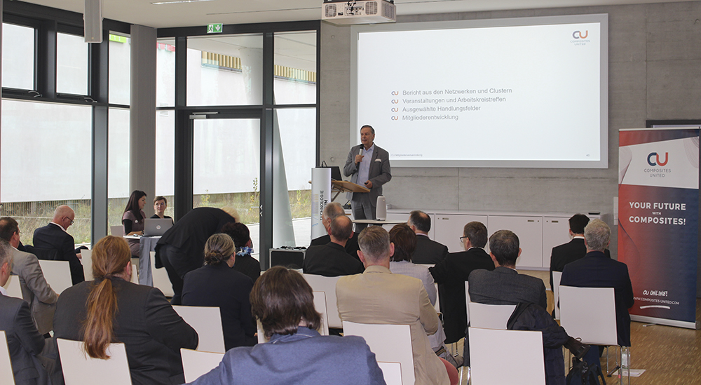 Vor dem Einstieg in die Tagesordnung gedachte er gemeinsam mit den Gästen dem kürzlich und unerwartet verstorbenen Ralph Hufschmied. Als Präsidiumsmitglied war Ralph Hufschmied auf vielfältige Weise im CU tätig und engagiert. Prof. Drechsler betonte, dass Ralph Hufschmied eine bleibende Spur in der Welt der Faserverbundtechnologien und sein Verlust eine spürbare Lücke in der CU-Gemeinschaft hinterlässt.