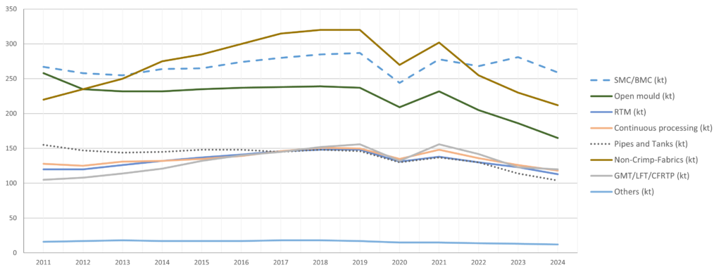 Die Offenen Verfahren – Handlaminieren und Faserspritzen – sind mit einer Herstellungsmenge von 165 kt weiterhin eines der größten Segmente im GFK-Markt in Europa. Im Jahr 2024 ging jedoch auch dieses Marktsegment um überdurchschnittliche 11,3 % zurück – bedingt durch strengere gesetzliche Auflagen, Fachkräftemangel und die abnehmende Nachfrage in speziellen Anwendungsbereichen.