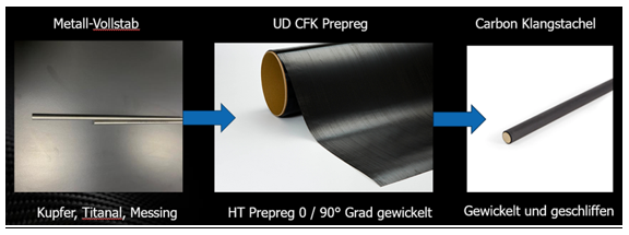 Die Herstellung der Klangstachel erfolgt im präzisen Prepreg-Wickelverfahren. Dabei werden Metallkerne mit einer hochwertigen CFK-Prepreg-Schicht umwickelt. Diese innovative Bauweise bietet entscheidende Vorteile: