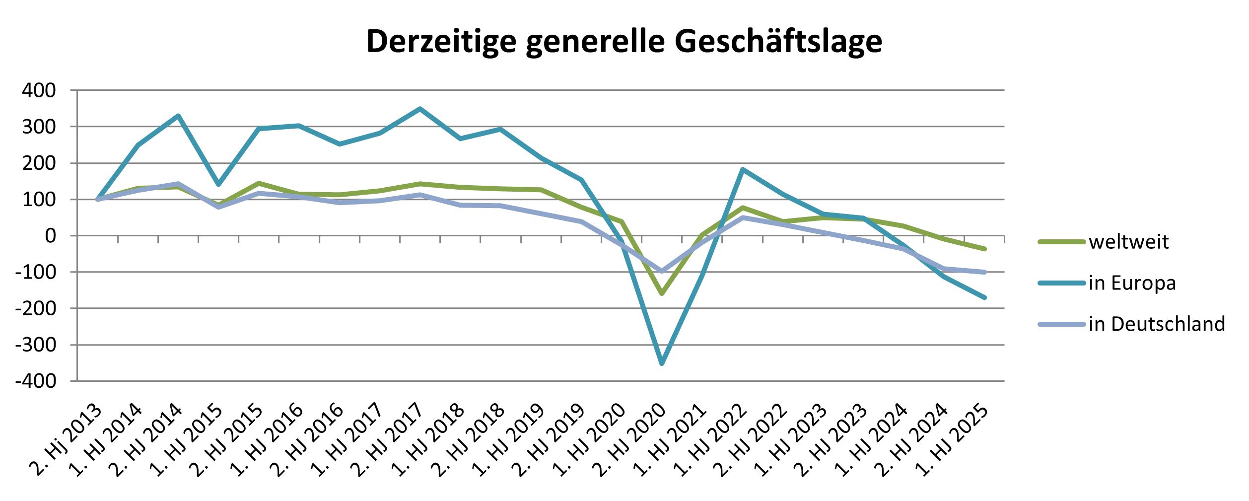 Mit Ausnahme einiger weniger positiver Tendenzen, zeigt der entsprechende Indikator seit 2022 deutlich nach unten. Auch in der aktuellen Befragung ist weiterhin keine Trendumkehr festzustellen. (vgl. Abb. 1). Die Bewertung der generellen Geschäftslage gibt in allen genannten Regionen deutlich nach.
