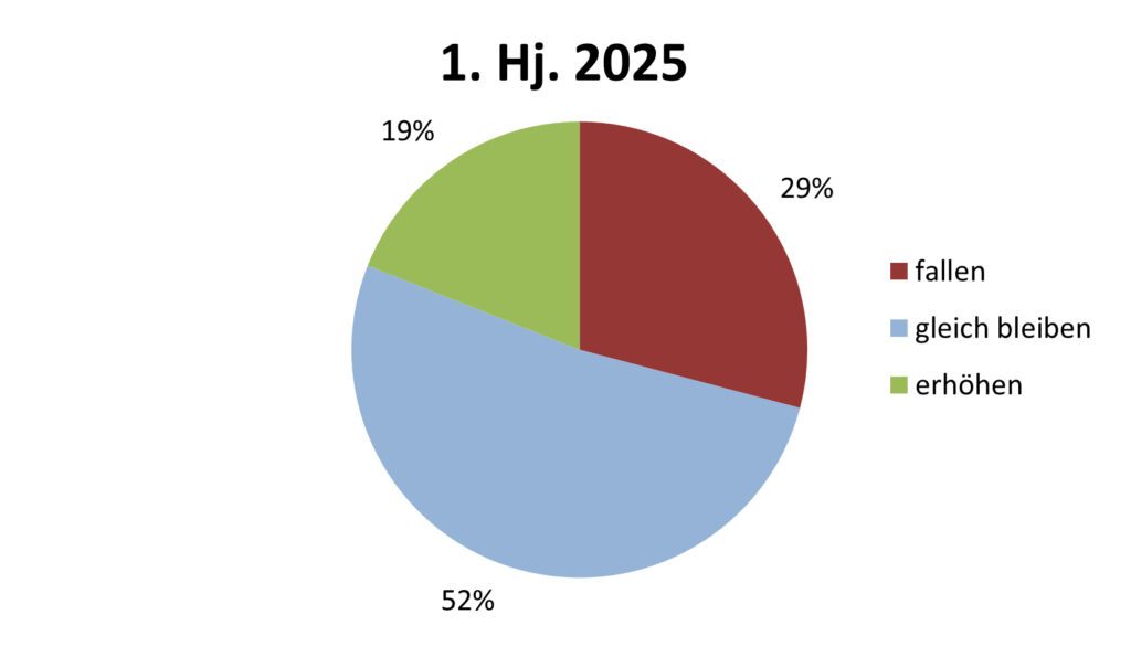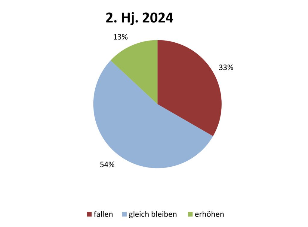 Nachdem in der letzten Befragung noch 13 % der Teilnehmenden von einem Anstieg der Personalkapazität ausgegangen waren (Befragung 2/2024), so liegt dieser Wert aktuell bei 19 %. Demgegenüber stehen aber immer noch 29 %, die von einem Rückgang im Bereich Personal ausgehen (vgl. Abb. 4).