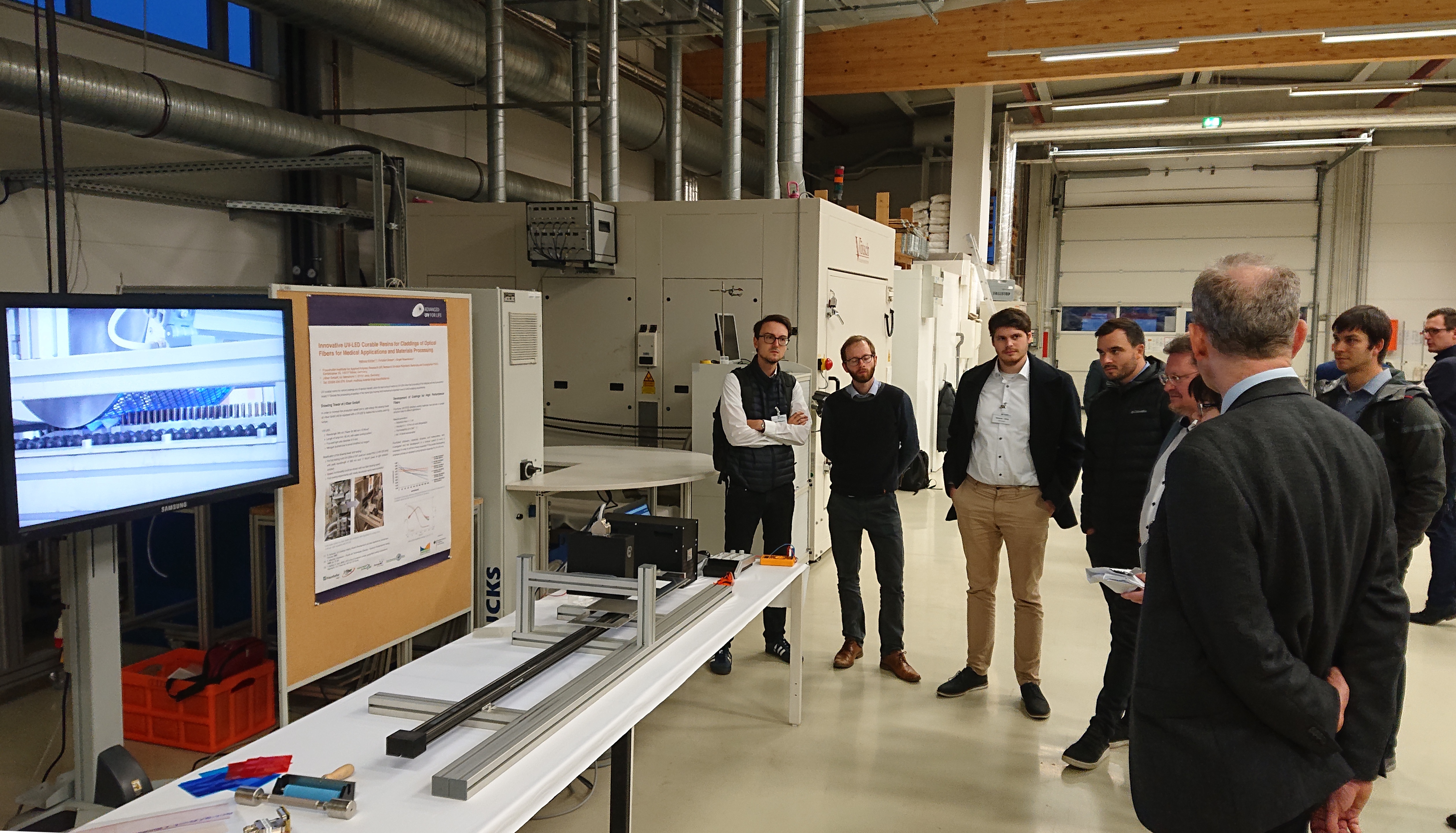 Abschließend nutzten die Teilnehmerinnen und Teilnehmer die Gelegenheit zu einem Rundgang durch das benachbarte Fraunhofer IAP. Im Forschungsbereich Polymermaterialien und Composite PYCO informierten sie sich über Herstellung und Verarbeitung von Prepregs mit Horizontal-Imprägnieranlage, Industrie-Durchlaufmikrowelle und AFP-Fertigungskomplex. Einig waren sich alle Anwesenden mit Forschungsbereichsleiter und BTU-Professor Prof. Holger Seidlitz, der „die besondere Bedeutung des Leichtbaus vor dem Hintergrund des Klimawandels und der Energiewende“ hervorhob.