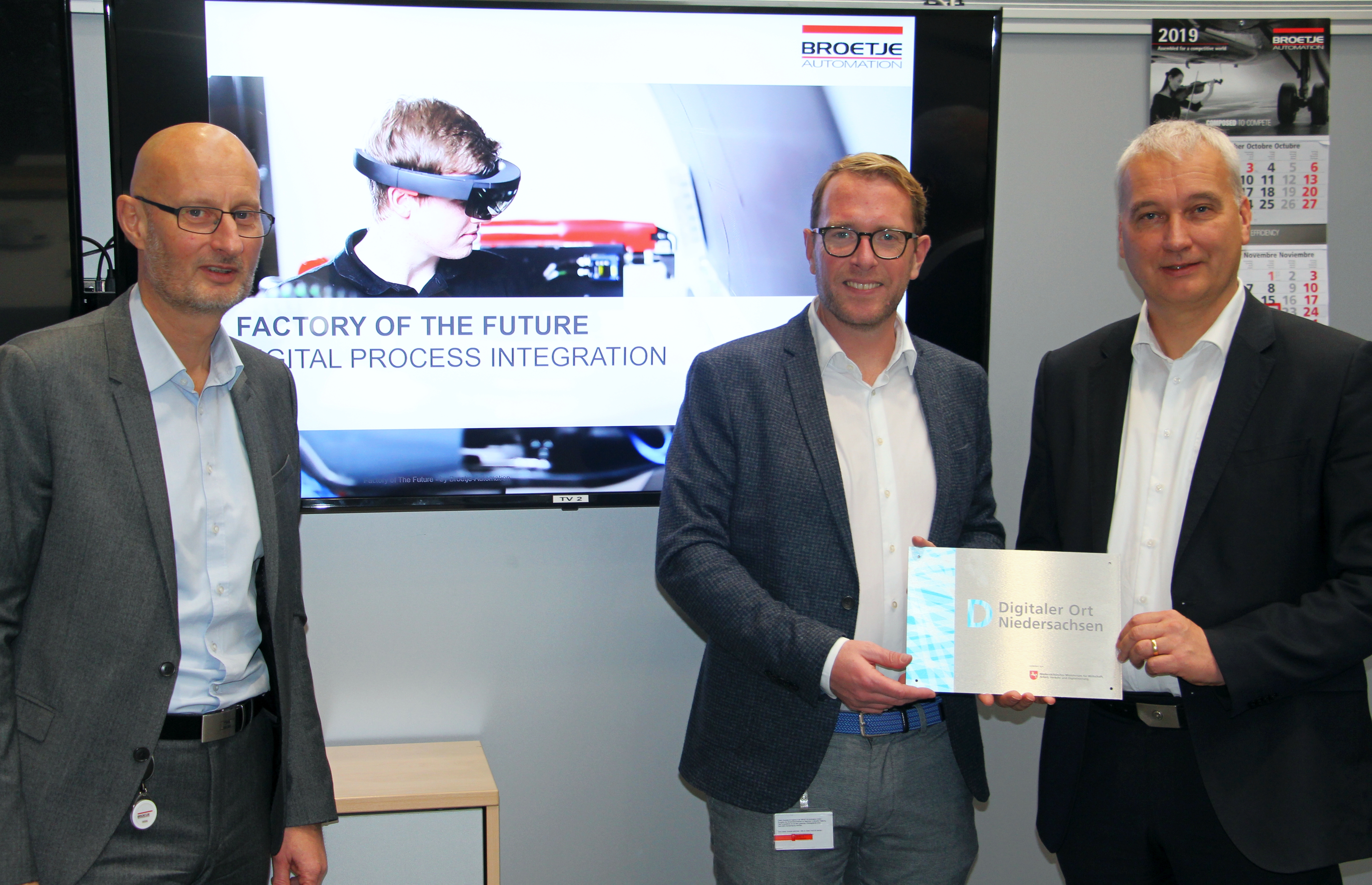 Bildunterschrift: Lutz Neugebauer, CEO Broetje-Automation (links) und Dr. Axel Peters, CTO Broetje-Automation (rechts) nahmen die Auszeichnung als „Digitaler Ort Niedersachsen“ von Staaatssekretär Muhle (mitte) entgegen. (© Broetje-Automation GmbH)