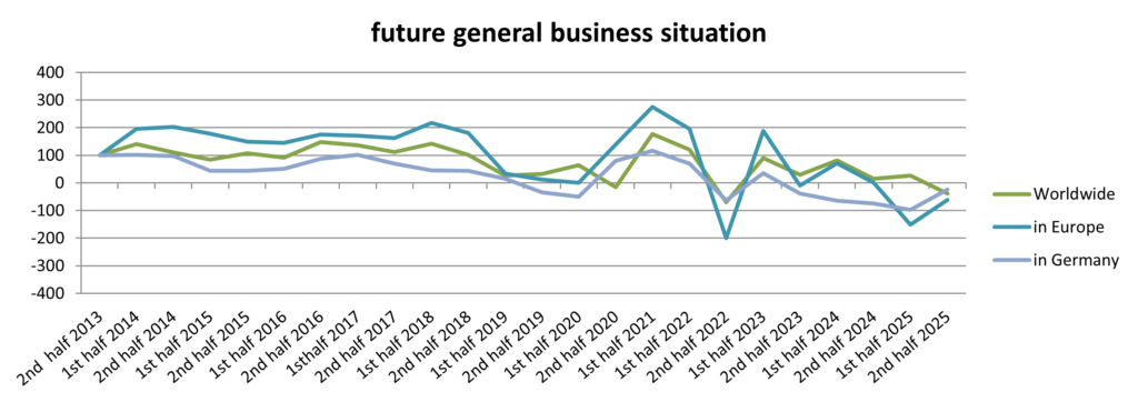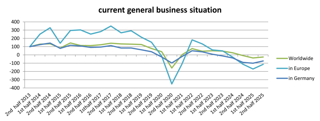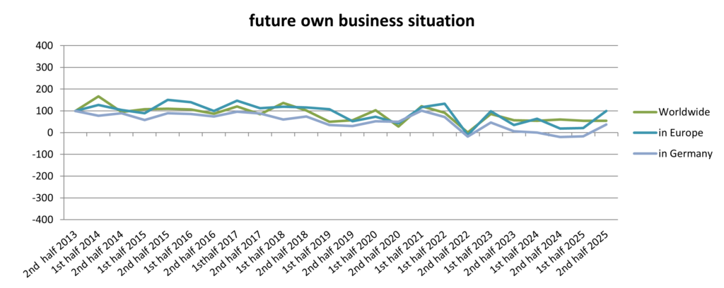 It is striking that in the current survey, the assessment of the general market situation for Germany and Europe tends to be more optimistic than for the situation worldwide. This becomes even clearer when assessing one’s own company. Here, positive assessments are evident for Germany and Europe, whereas the global situation is viewed critically. It remains to be seen whether this is a general trend or just a snapshot in an otherwise rather negative market environment.