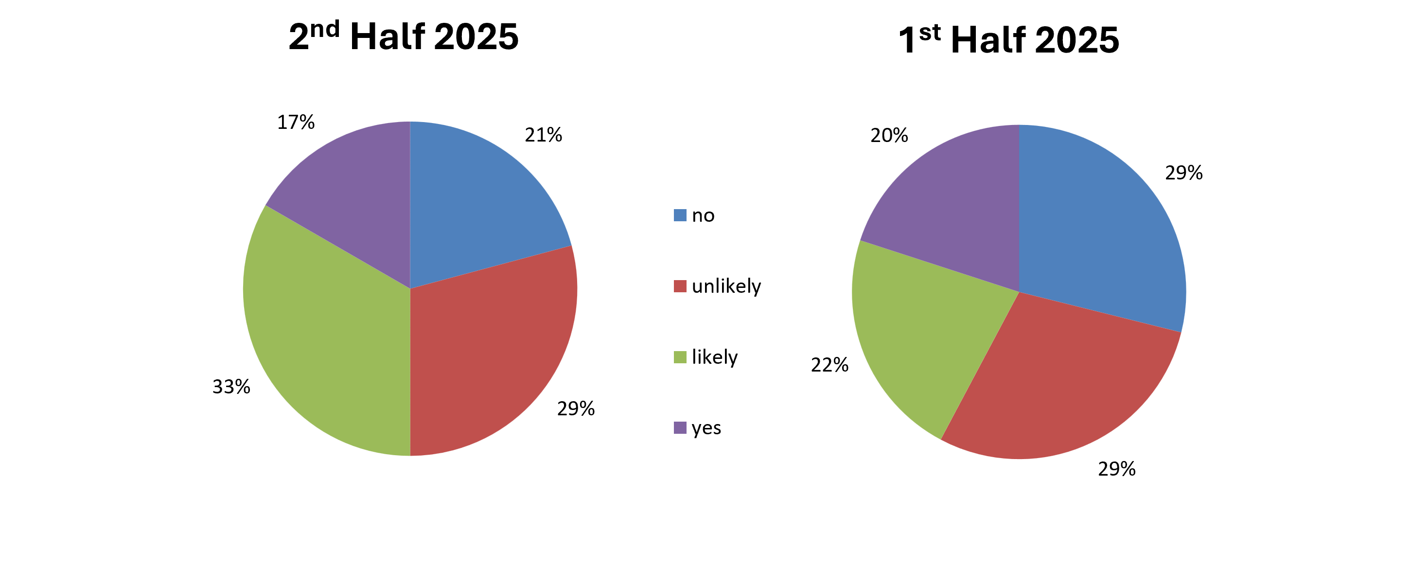 The proportion of respondents who consider machinery investments likely or are planning them has increased from 42% (survey in the first half of 2025) to 50%, although the proportion of those who are already planning specific investments has declined slightly. (See Fig. 4). Here, too, there is a generally optimistic trend, albeit with a rather wait-and-see attitude. This underscores the assessment that it remains to be seen whether the current development is a general trend reversal or just a brief burst of optimism.
