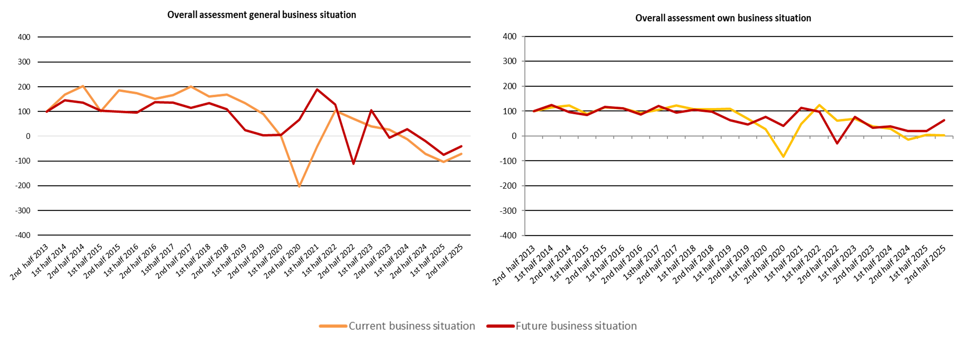 The assessment of the current general business situation is turning positive. The assessment of the general business situation remains somewhat more optimistic than that for their own companies, which is also brightening slightly.