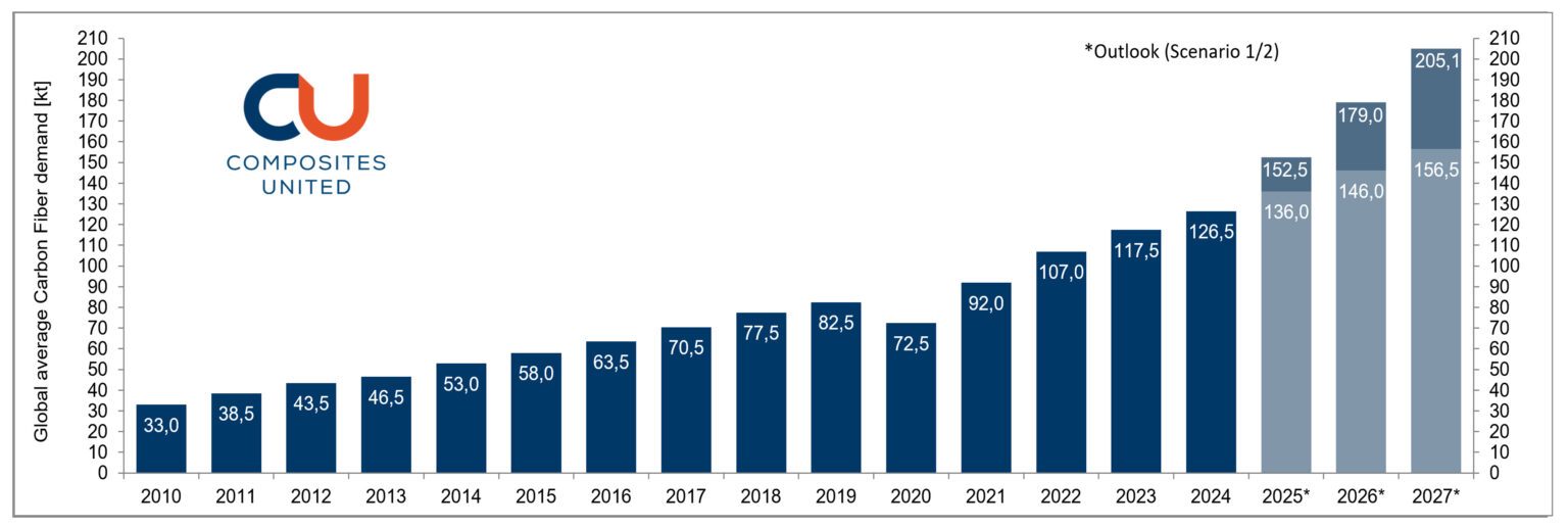 A demand volume of 126,500 tons was determined for the 2024 reporting year. This corresponds to an increase of +7.66% over the previous year. Sustained positive developments are forecast for the coming reporting years, with two different scenarios being used for the prediction. On the one hand, constant growth based on CAGR (2019-2024) of approx. +7.38% is used. On the other hand, the expansion programs already in the final stages of completion with regard to CF production capacity (name plate capacity) and an estimate of the associated capacity utilization rates are used. While these two scenarios do not represent a general lower or upper development limit, this methodology has been quite successful in narrowing down the real development range over the past reporting years. In particular, the implemented expansion of CF production capacity in the reporting year 2025 is significantly above average. At around +26.5%, this is well above the average relative expansion of around +6.5% for corresponding expansion measures since 2017. Chinese market participants, who successfully implemented very large capacity expansions in the reporting year, receive special attention. Further details and special news can be found in the long version of the market report.
