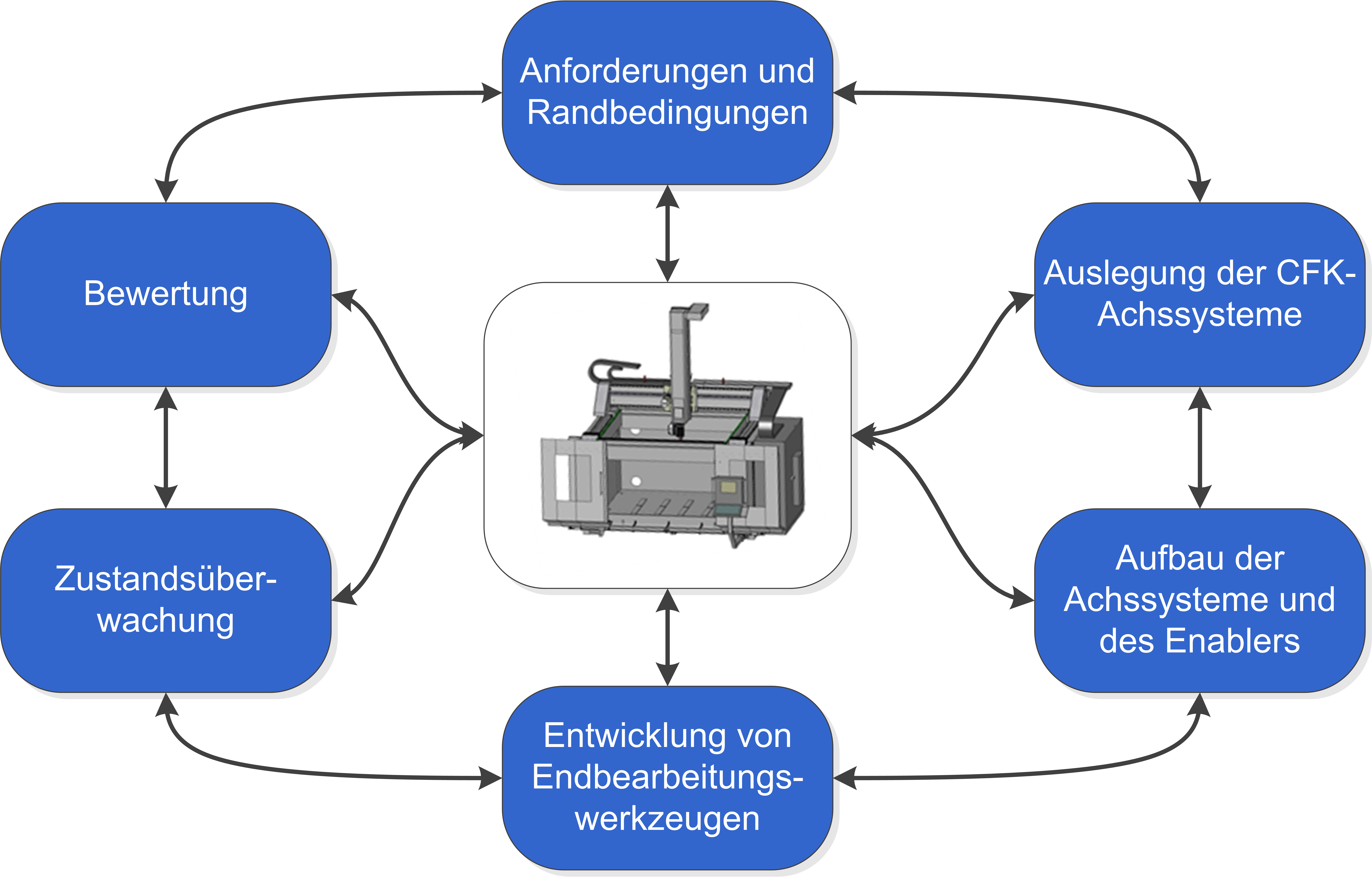 Zu Beginn erfolgen mit allen beteiligten Partnern eine Anforderungsanalyse und eine Definition von Randbedingungen. Anschließend beginnt die Konstruktion und Auslegung der CFK-Achssysteme mit einer Erarbeitung von geeigneten Lasteinleitungs- und Verbindungskonzepten. Die hierbei erzielten Ergebnisse fließen einerseits für die Herstellung der CFK-Achssysteme und andererseits für die Integration von CFK- und Metallkomponenten in die Grundmaschine zum Enabler ein. Ein wichtiges Arbeitsfeld bei der Entwicklung von Endbearbeitungswerkzeugen für CFK-Strukturen stellt u.a. der HSC-Prozess (High Speed Cutting) dar. Als weiteres bedeutendes Merkmal ist einerseits die Umsetzung einer Zustandsüberwachung für eine strukturelle CFK/Metall-Komponente beim Betrieb in einer Hochgeschwindigkeitsbearbeitungszelle zu sehen. Andererseits sollen die Erprobung und Umsetzung eines neuen Konzeptes zur indirekten Werkstoffprüfung bei der zerspanenden Bearbeitung (z.B. Ultraschalltomographie) erfolgen. Abschließend soll die Bewertung des Enablers mit allen Projektpartnern durchgeführt werden.