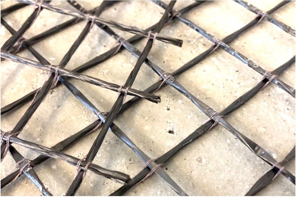 Carbonbewehrungen eignen sich perspektivisch auch für Lastabtragung, Rissbegrenzung und Lebensdauerverlängerung in der Asphalttragschicht von Fahrbahnen. Weil aber die grobkörnige Asphalttragschicht sehr robust und dehnsteif sein muss, sind Bewehrungsstrukturen mit großen Garnquerschnittsflächen (5,4 – 10,8 mm²) und Gitteröffnungen notwendig. Hierfür eignen sich insbesondere tetraederförmige Bewehrungen, da ihre materialgerechte Geometrie minimale Strukturdehnungen sowie eine feste Verankerung im Asphalt ermöglicht. Die für Asphalt geeigneten Carbonbewehrungen entwickeln ITM und ISS gemeinsam.