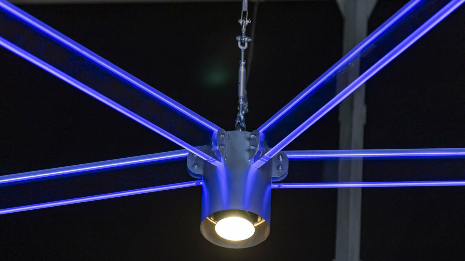 verbunden sind. So entsteht ein geometrievariables Gitter, wobei Kunststoff-Stabsegmente und Knoten in beliebiger Anzahl aneinandergereiht werden können. In den lichtleitenden Stäben sind LED-Streifen integriert, in den Knoten befinden sich LED-Spots. Über eine integrierte DALI-Steuerung können individuelle Beleuchtungsszenarien dimmbar und farblich veränderbar umgesetzt werden.