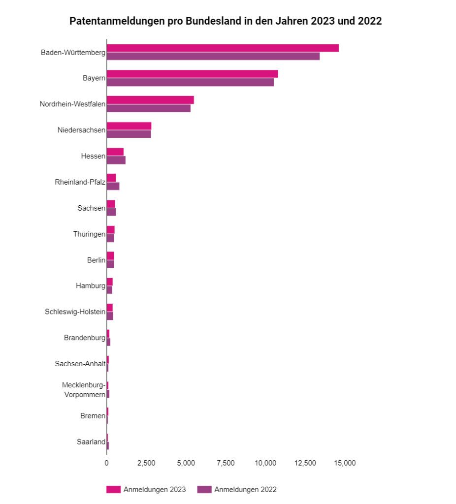 Die meisten Patentanmeldungen kommen auch 2023 aus Baden-Württemberg und Bayern. Diese Bundesländer sind mit 14.648 bzw. 10.805 Anmeldungen für über die Hälfte der deutschen Patentanmeldungen verantwortlich (66,2 %). Im Bereich der neuen deutschen Bundesländer führt der Sachsen weiterhin die Statistik an – jedoch sank die Anzahl der Anmeldungen aus dem Freistaat von 592 Anmeldungen auf 544. Vor allem im traditionell stärksten Bereich, Elektrische Maschinen und Geräte, ging die Innovationskraft zurück (- 19,8 %). Dafür konnten die sächsischen Forschenden und Unternehmen 2023 sowohl in den Bereichen Messtechnik (+ 28,6 %) und Computersysteme (+ 12,5 %) hohe Zuwächse verzeichnen. Thüringen folgt mit 502 Patenten, und legt sowohl in der Medizintechnik (+ 6,8 %), Optik (+ 17,1 %) als auch bei Elektrischen Maschinen und Geräten (+ 69,4 %) stark zu.