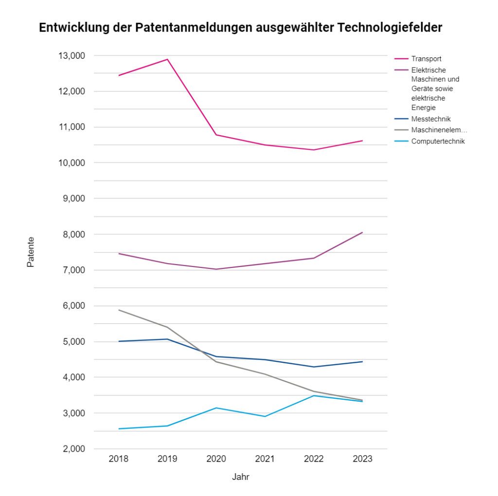 Die Entwicklung in den Technologiefeldern ist erneut durchwachsen. Während bei den Elektrischen Maschinen und Geräten und in der elektrischen Energie der Positivtrend aus dem letzen Jahr anhielt (+ 9,9 %), wurde der Aufstieg der Computertechnik im Jahr 2023 gebremst (2022: +19,5 %, 2023: -4,6%).
