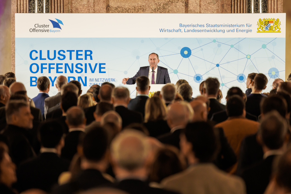 Staatsminister Hubert Aiwanger begrüßt die Gäste des Clusterempfangs und spricht den Clustern seinen Dank aus