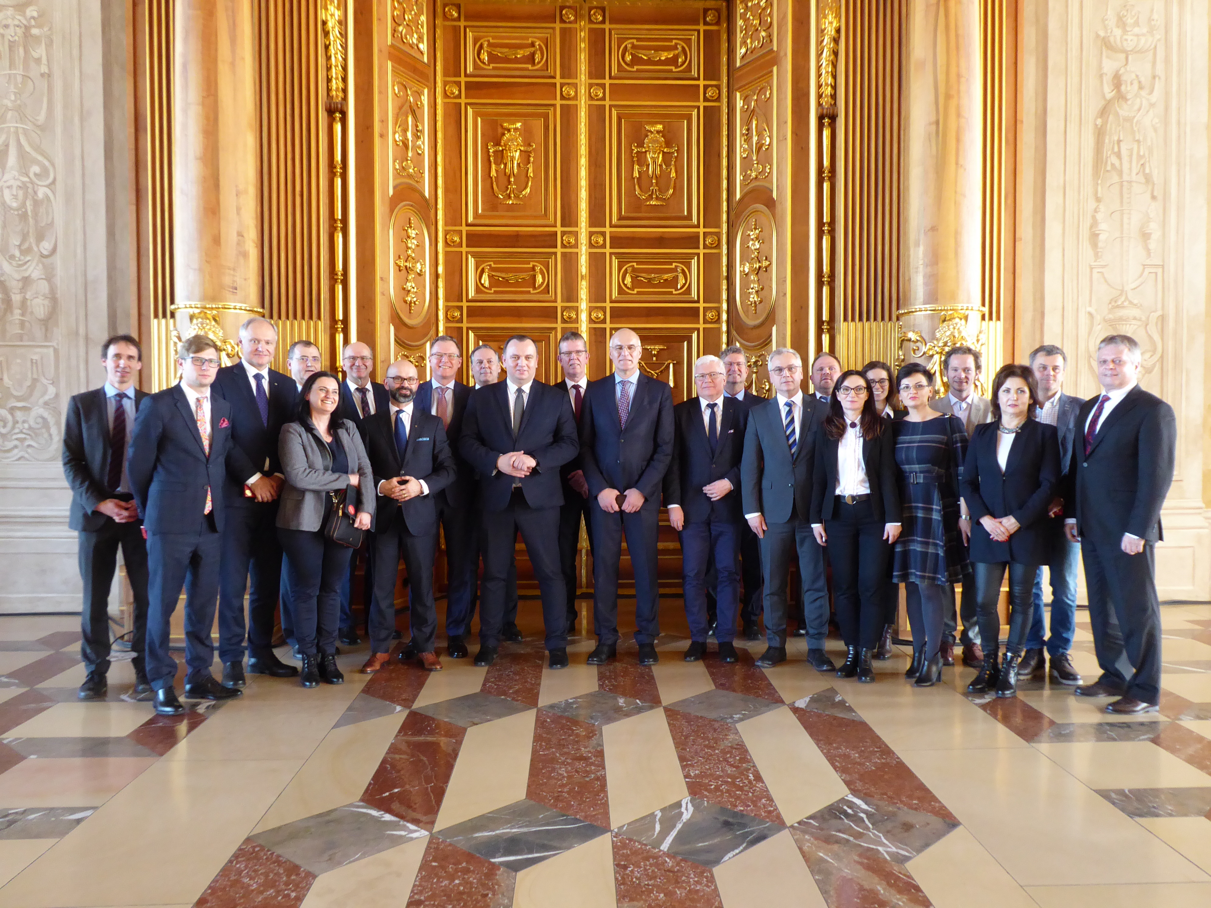 Auch Augsburgs Oberbürgermeister Dr. Kurt Gribl ließ es sich nicht nehmen, Marschall Chełstowski und sein Team im prächtigen Goldenen Saal des Rathauses willkommen zu heißen. Dabei unterstrich Gribl die große Bedeutung des Composites United bei der Förderung innovativer Leichtbaumaterialien und –Technologien. Insbesondere der bayerische Spitzencluster MAI Carbon des CU habe sich um die Vernetzung der regional stark vertretenen Fachunternehmen zu einem überregional ausstrahlenden Kompetenzzentrum sehr verdient gemacht. Dass „diese Vernetzung nun auch grenzüberschreitend mit den Vertretern aus Polen möglich werden soll“, begrüßte Gribl ausdrücklich.