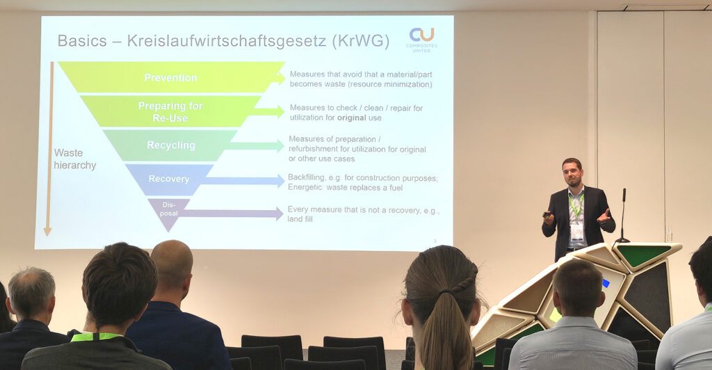 Dr. Bastian Brenken, CTO und Experte für Nachhaltigkeit bei Composites United (CU), beleuchtete in seiner Präsentation „Circularity of Fiber Composites“ die aktuellen Herausforderungen und neuen Verordnungen im Zusammenhang mit der Kreislauffähigkeit von Faserverbundwerkstoffen. Sein Vortrag lieferte wertvolle Einblicke in die Möglichkeiten und Entwicklungen zur Förderung der Nachhaltigkeit in der Branche und stieß auf großes Interesse bei den Teilnehmenden.