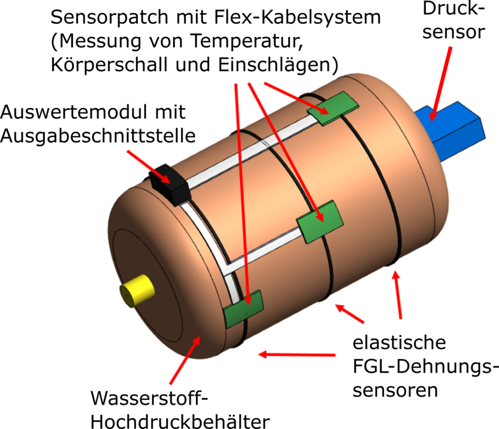 Hochdruckbehälter aus Faserverbundwerkstoffen sind sehr effiziente Speicher für Wasserstoff. Eine Strukturüberwachung liefert quantitative Daten aller einwirkenden Belastungen, um daraus den Zustand des jeweiligen Behälters zu beurteilen, Belastungsgrenzen zu definieren und die Lebensdauer vorherzusagen. Damit ist eine längere Nutzungsdauer realisierbar und fortwährend die höchste Sicherheit gewährleistet.