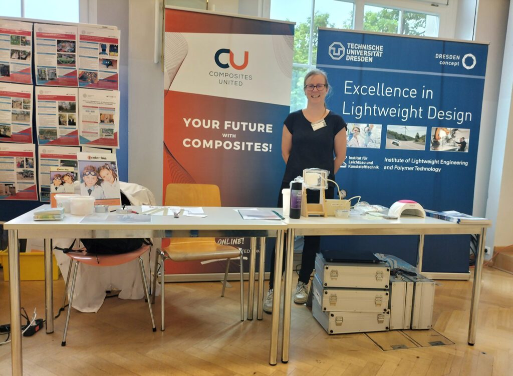 Auf dem Markt der Möglichkeiten hat sich das Cluster CU Ost des Composites United zusammen mit dem juniorIng. Sachsen e.V. und dem Institut für Leichtbau und Kunststofftechnik (ILK) der TU Dresden mit allerlei Workshopangeboten vorgestellt. In vielen anregenden Gesprächen mit Lehrer:innen, Studierenden und auch Vertretern im Bereich der außerschulischen und schulischen Bildung wurde über mögliche Kooperationen gesprochen und auch Erfahrungen ausgetauscht.