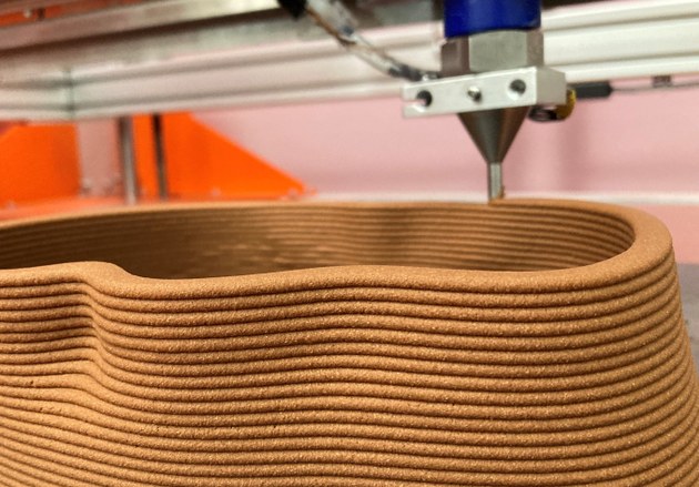 Während des Forschungsprojektes wurden bereits umfangreiche Materialuntersuchungen durchgeführt, um geeignete naturstoffbasierte Materialien für das 3D-Druckverfahren zu identifizieren. Anstelle von herkömmlichen thermoplastischen Kunststoffen kommt eine plastische Masse zum Einsatz, die recycelbar, stabil, leicht und kostengünstig sein muss. So wurden bereits verschiedene Bindemittel, wie Agar-Agar, Carrageen und Zellleim, für den Einsatz im LDM-Verfahren getestet, jedoch führten diese oft zu langen Trocknungszeiten, starker Schrumpfung und geringer Haftung. Die Lösung fand sich in Glutinleim, der bei Raumtemperatur zu einem stabilen Thermoplast-Elastomer aushärtet. Eine gleichmäßige Schrumpfung wird bereits bei der Erstellung des 3D-Modells berücksichtigt. In Kombination mit geeigneten Füllstoffen und Additiven wird es zu einer schlagzähen Masse, die vollständig kompostierbar und recyclingfähig ist.