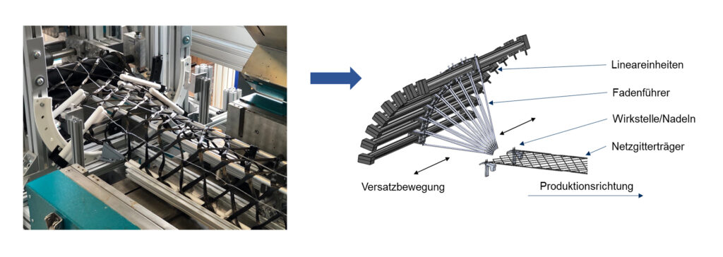 Abb. 2: Entwicklung einer erweiterten Kettfadenversatztechnologie (re.) und neuartigen Umformeinrichtung (li.) zur Fertigung von 3D-Netzgitterträgern