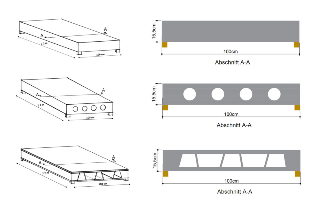 Abb. 5: Gegenüberstellung unterschiedlicher Plattenarten für Deckensysteme; oben: Vollplatte (VP), Mitte: Hohlplatte für Stahlbewehrung (SH), unten: neuartige Hohlplatte für Netzgitterträger-Bewehrung (NH)