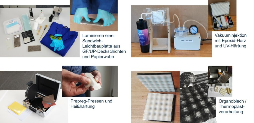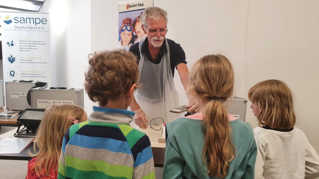 Unter dem Motto „Märchenhafte Welt der Kohlenstofffasern“ luden die beiden CU-Mitglieder Institut für Leichtbau und Kunststofftechnik sowie Institut für Textilmaschinen und textile Hochleistungswerkstofftechnik der TU Dresden an das gemeinsame „Research Center Carbon Fibers Saxony“ ein. An verschiedenen Stationen konnten die kleinen und großen Gäste das Thema Composites-Leichtbau erleben. Der Leichtbau-Ingenieur Dr. Christoph Irmler stellte im Rahmen einer Kooperation von CU Ost und juniorIng. Sachsen e. V. verschiedene Faserverbundherstellungstechnologien direkt aus den portablen CU Ost-Experimentierkoffern vor. Diese beinhalten alle Materialien, Vorrichtungen, Anleitungen, Sicherheitshinweise und natürlich die Schutzausrüstung für die mobile Demonstration der Technologien Handlaminieren und Vakuuminjektion mit UV-Härtung, Prepreg-Pressen sowie Organoblechverarbeitung mit Thermoplastmatrix.