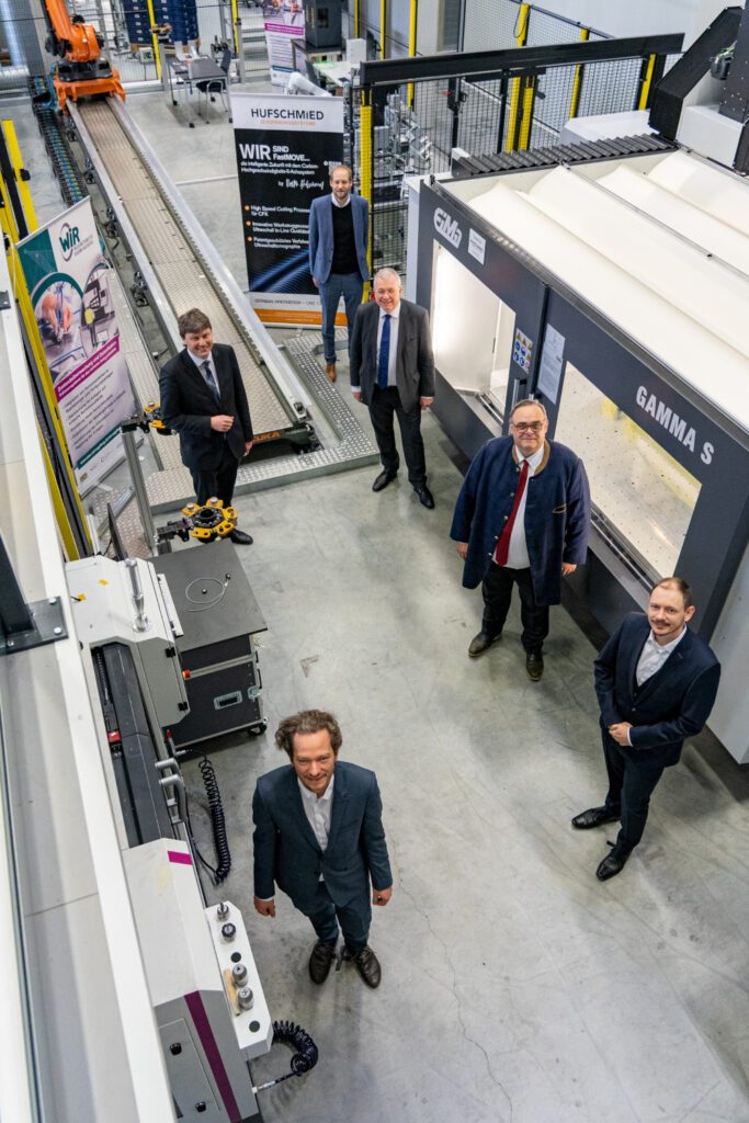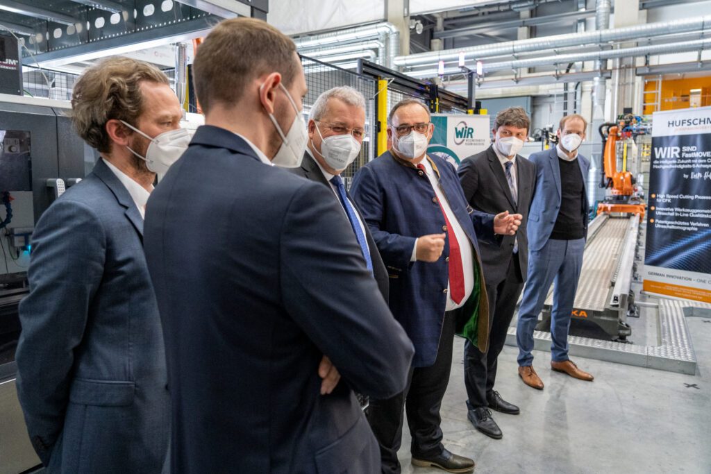 Doch das Highlight von MAI Carbon, also unser MAILight, war für uns der feierliche Abschluss des gemeinsamen Forschungsprojekts MAI CC4fastMOVE. Am 18. März 2022 übergab die Hufschmied Zerspanungssysteme GmbH einen im Rahmen des Projekts entwickelten Fräsen-Demonstrator an die Universität Augsburg im Technologiezentrum Augsburg. Die mit hochsteifen Achsen aus Carbonfaser-Verbundwerkstoffen und Spezialwerkzeugen für die Hochgeschwindigkeits-bearbeitung umgerüstete Portalfräsmaschine ermöglicht die Bearbeitung von Verbundmaterialien mit deutlich gesteigerter Effizienz und Oberflächengüte. Gefördert wurde das Projekt vom Bayerischen Staatsministerium für Wirtschaft, Landesentwicklung und Energie.