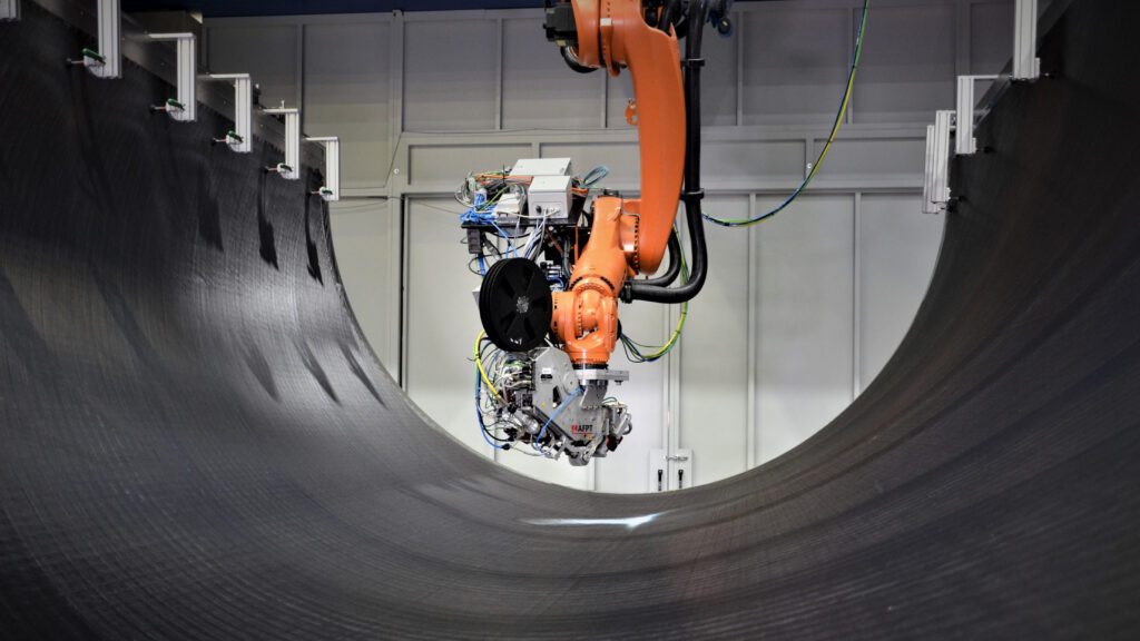 Um die Flugzeughaut herzustellen, setzte das DLR-Team einen kopfüber hängenden Roboter ein, der die Materialstreifen per Laser punktgenau erwärmt und in Schichten abgelegt, sodass ein Laminat aus faserverstärkten Kunststoffen entsteht. Der Materialverschnitt ist minimal – ressourcenschonend und ein wichtiger Aspekt für die Kostenbilanz, da CFK erheblich teurer ist als Aluminium. Zudem entfällt das anschließende Festigen im Autoklav, wie es sonst bei Flugzeug-Bauteilen aus Carbon notwendig ist. Das verkürzt die Produktionszeit um bis zu 40 Prozent und reduziert dadurch weitere Kosten.