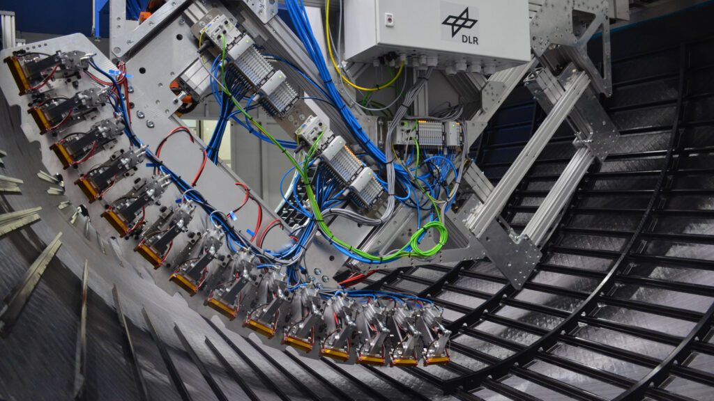 Die dritte Technologie die das DLR-Team entwickelt hat, betrifft die Montage der Querversteifung. Die sogenannten Spante wurden per Strom erhitzt und mit Hilfe eines speziell entwickelten Werkzeugs widerstandsgeschweißt. Das Verfahren ist äußerst robust und liefert höchste Schweißfestigkeiten. So reduzieren thermoplastische CFK gegenüber Aluminium weiter die Produktionszeit und damit die wirtschaftlichen Herstellkosten. Da die Bohrungen wegfallen, bleibt auch hier die lasttragende Flugzeughaut intakt und staubfrei.
