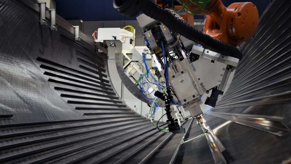 Im nächsten Produktionsschritt galt es die Außenhaut mit Längsversteifungen zu versehen. Anstatt die 44 Stringer zu vernieten, wurden sie per Ultraschall auf das Bauteil geschweißt – eine Weltneuheit. Dazu ließen die ZLPler einen Roboter an den Stringern entlangfahren, mit einer hochpräzisen automatischen Pfadkorrektur. Diese Methode ist deutlich schneller als das herkömmliche mechanische Arbeiten. Sie hat, wie auch die folgende Fügetechnologie, einen weiteren Vorteil: Es entstehen keine Späne oder Staub, sodass man Komponenten vorausrüsten kann und erst in der Endmontage die Rumpfschalen zusammenfügt. Bei einer Metallkonstruktion würden Späne etwa die Hydraulik, Elektrik oder andere Installationen im Flugzeugrumpf beschädigen.