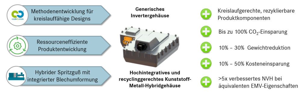Vor diesem Hintergrund nimmt sich das Projekt EAC+ zum Ziel, kreislauffähige und zugleich ökonomisch sowie technisch konkurrenzfähige Gehäusestrukturen zu entwickeln. Diese sollen einerseits den hohen elektromagnetischen Anforderungen der Elektromobilität gerecht werden und andererseits ein hohes Potential haben, in verschiedensten Branchen Anwendung zu finden. Die entwickelten Strukturen sollen an einer der technologisch anspruchsvollsten Komponenten elektrischer Fahrzeuge, dem Gehäuse des Traktionsinverters, demonstriert werden.