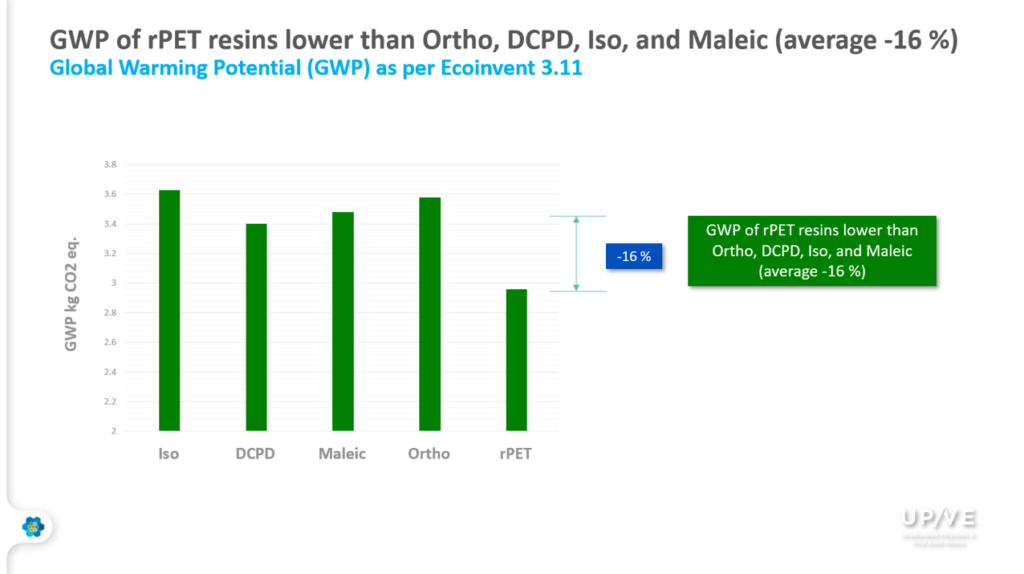 The GWP data for Unsaturated Polyester (UP) and Vinyl Ester (VER) resins from Ecoinvent 3.11 are shown to be 2-8 % lower than the equivalent values from Ecoinvent 3.10 (which is the combined effect of changes deriving from resin manufacturing and from raw material contributions). The GWP of resins based on rPET waste is 16 % lower than the GWP average of Ortho, DCPD, Iso, and Maleic resins, indicative of the positive effect of using recycled raw materials on the eco-footprint of resin manufacturing.