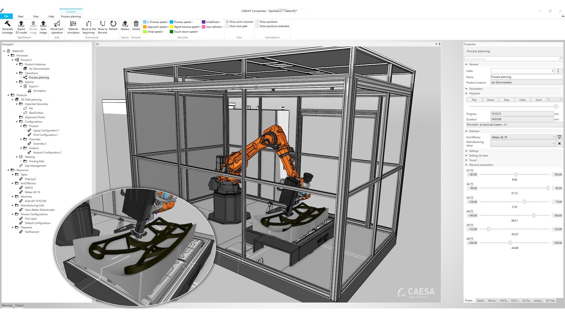 Mit CAESA wurden aber nicht nur die Bewegungen des Druckkopfes programmiert; die Software wurde auch eingesetzt, um die digitale Abbildung des Druckprozesses durchzuführen – einschließlich des Aufbaus eines digitalen Zwillings. Dieser umfasst die Erstellung der Schichten, die entlang mehrfach gekrümmter Oberflächen in 3D gedruckt werden, sowie die Entwicklung von Algorithmen für komplexe, organisch geformte Geometrien.