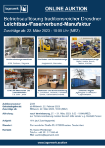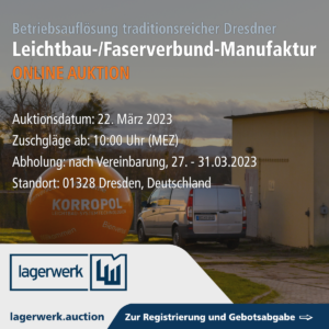 Die Leichtbau-Systemtechnologien KORROPOL GmbH versteigert online ca. 400 Positionen, u. a. Holzbearbeitungsmaschinen, Flurförder- und Firmenfahrzeuge, Elektro- und Handwerkzeuge, Werkstatt- und Büroausstattung, GFK/CFK-Materialien und -Laminierformen, Container, Regale u.v.m., da sie das Geschäftsmodell der Fertigung von Faserverbundstrukturen aufgeben wird.