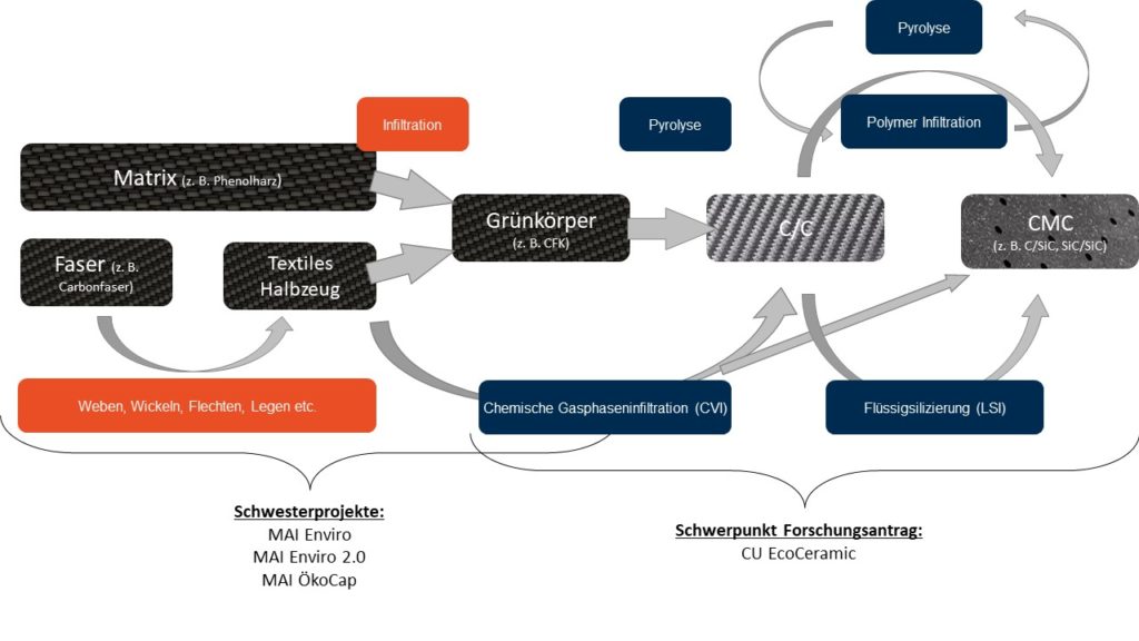 Das Projekt „CU EcoCeramic“ befasst sich mit der ökobilanziellen und ökonomischen Bewertung von faserkeramischen Verbundstrukturen (CMC). Dabei gilt, bestehende Hemmnisse beim Einsatz von CMC zu überwinden und eine reale Schließung des Wertstoffkreislaufs zu erreichen. Das Forschungsziel ist es, die Akzeptanz von CMC in Gesellschaft, Wirtschaft und Politik zu festigen und auszubauen. Dabei soll eine belastbare und transparente Darstellung des heutigen und zukünftigen ökologischen und ökonomischen Fußabdrucks von CMC dem breiten deutschen Mittelstand helfen, diese Werkstoffklasse zukünftig als „Enabler“ für notwendige technologische Lösungen so einzusetzen, dass sie einen Beitrag zur Einhaltung der Pariser Klimaziele 2050 leisten können.