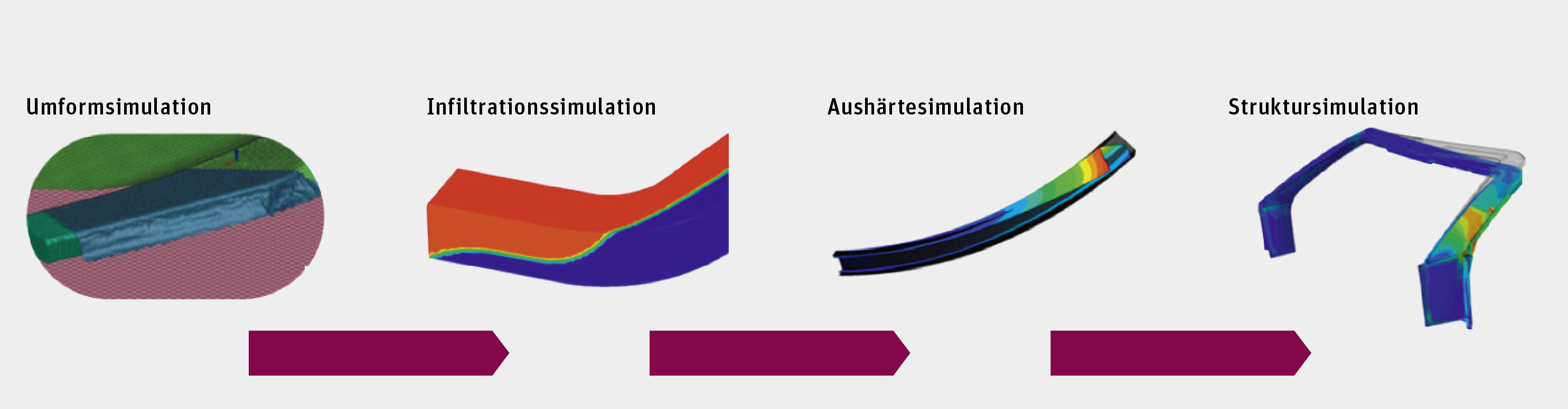 Durch die beginnende Großserienproduktion von Faserverbundstrukturen rückt zunehmend die fertigungsgerechte Bauteilauslegung in den Vordergrund. Eine wichtige Voraussetzung ist eine integrale Betrachtung des gesamten Fertigungsprozesses. Eine durchgängige Fertigungssimulationskette für FVW bis hin zur Bauteilauslegung steht allerdings bisher nicht zur Verfügung. Die Verbindung zwischen den einzelnen Fertigungssimulationsbereichen, die Integration in eine Simulationskette bzw. Plattform, ist ein wichtiger Punkt in diesem Projekt (siehe Abb.). Im Sinne einer ganzheitlichen Nachweisphilosophie soll diese Integration auf die Bauteilauslegung erweitert werden. Damit können die Fertigungseinflüsse direkt in die Bauteilauslegung mit eingebunden werden. Ebenso soll ein Ansatz zur Auswahl von faser- und fertigungsgerechten Composite Bauweisen vor dem Hintergrund der zunehmenden Großvolumenfertigung erarbeitet werden.