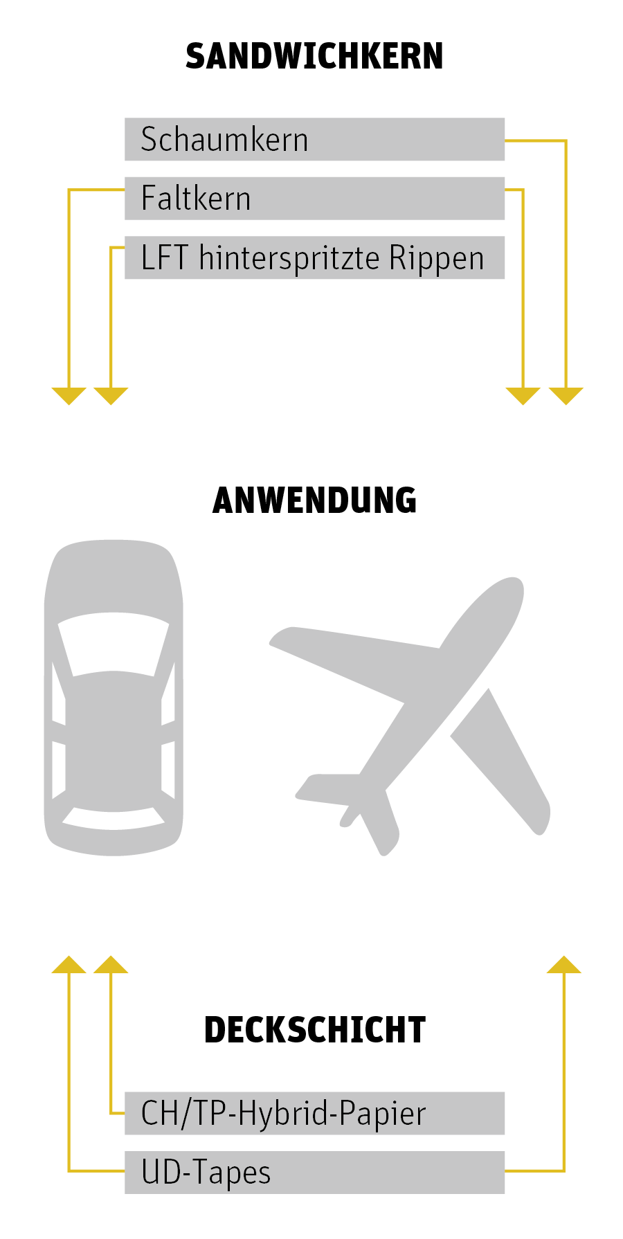 Ziel des Vorhabens MAI Sandwich ist es daher, neuartige und kostengünstige Fertigungsverfahren zur Herstellung von gewichtsoptimierten neuen Sandwichstrukturen mit hoher Funktionsintegration für den Einsatz im Automobil und in Luftfahrtzeugen zu entwickeln. Die neuen Sandwichstrukturen sollen dabei sowohl aus einem neuen Kernmaterial als auch aus neuen CFK-basierten Deckschichten unter Einsatz von recycelten Carbonfasern hergestellt werden. Zur Realisierung der Projektziele werden innerhalb des Vorhabens drei verschiedene Prozessrouten unter besonderer Berücksichtigung eines sortenreinen und wiederverwertbaren Werkstoffeinsatzes untersucht, die im Ergebnis zu unterschiedlichen Sandwichmaterialien führen sollen.