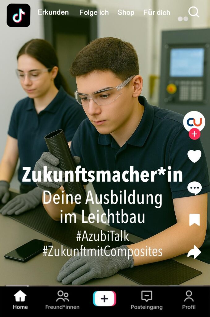 Genau hier setzt das neue Projekt „CU connect“ des Composites United e.V. (CU) an. Ab Mai 2025 unterstützt der Verband über einen Zeitraum von drei Jahren KMU der Leichtbaubranche dabei, neue Wege in der Nachwuchsgewinnung zu gehen. Im Zentrum steht Social Media Recruiting – vor allem über die Plattform TikTok. Ziel ist es, Ausbildungsplätze und Berufsbilder modern, authentisch und zielgruppengerecht zu präsentieren und damit junge Talente für duale Ausbildungsberufe in Kunststofftechnik, Maschinenbau oder Textiltechnik zu begeistern.