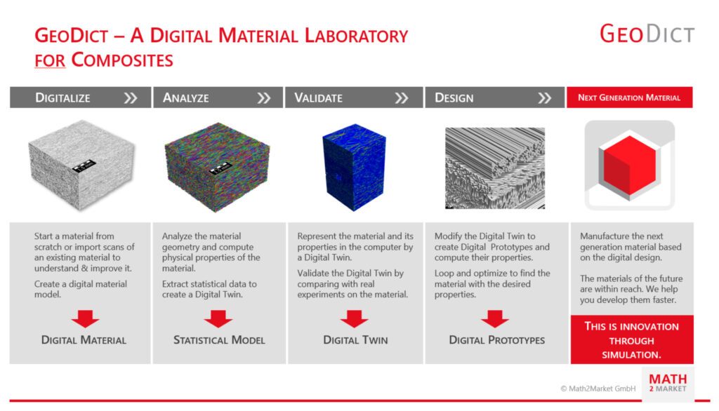 Die Math2Market, ein Spin-off des Fraunhofer ITWM in Kaiserslautern, entwickelt und vertreibt die GeoDict-Software als digitales Materiallabor. Der experimentelle Aufwand bei der Materialprüfung oder -entwicklung kann durch Simulation erheblich reduziert und Kosten eingespart werden. Neben Verbundwerkstoffen sind verschiedenste Materialthemen wie Filtration, Batterietechnik und Gesteinsanalyse wichtige Anwendungsfelder. CT-Scans am Beginn einer Materialprüfung können umfassend statistisch ausgewertet oder als digitaler Zwilling für die Simulation genutzt werden. Die Verfahren werden z. B. für die Qualitätskontrolle gewickelter Wasserstofftanks genutzt, wobei Einzellagen und Faserausrichtung geprüft werden. Neue Materialien und deren Eigenschaften können gezielt für Anwendungen simuliert werden. Das spart Zeit und Kosten für aufwendige Versuche. Math2Market möchte weitere Anwender bei der Materialentwicklung unterstützen.