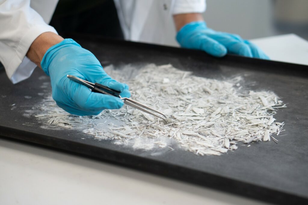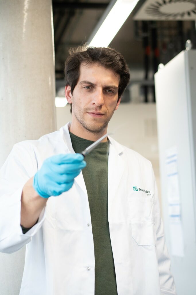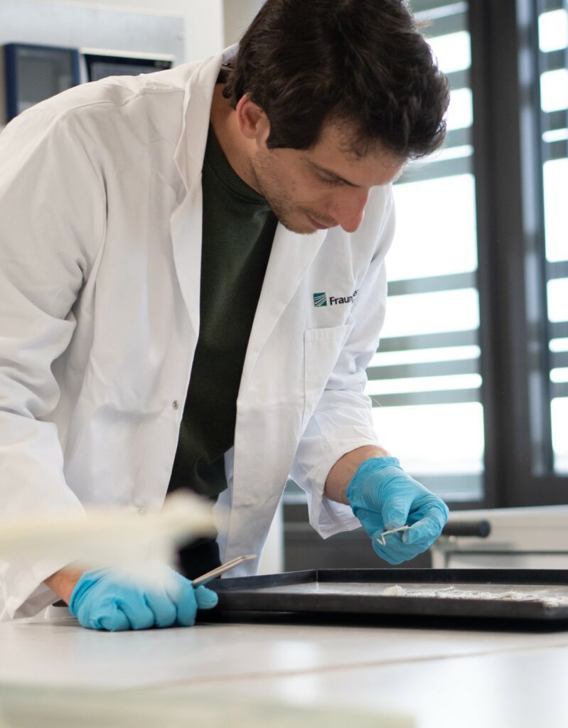 Fabian Rechsteiner vom Fraunhofer IGCV untersucht den zerkleinerten, faserverstärkten Kunststoff eines Rotorblatts.