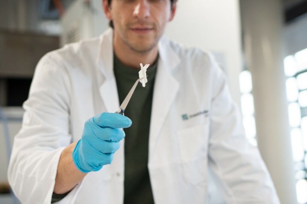 Wir verwenden einen Pyrolyse-Prozess, bei dem der zerkleinerte, faserverstärkte Kunststoff unter Ausschluss von Sauerstoff erhitzt wird. Das passiert unter Stickstoffatmosphäre, damit der Kunststoff nicht verbrennt, sondern sich thermisch zersetzt. Das Ziel des Prozesses ist es, die Fasern– meist Carbon- oder Glasfasern – vom Kunststoff zu trennen. Im Anschluss versuchen wir aus der Faser wieder ein Textil zu gewinnen. Die Fasern verarbeiten wir dann nicht mehr in ihrer ursprünglichen, endlosen Form, sondern als kürzere Varianten zu einem Vlies. Eine Herausforderung liegt für uns darin, die Fasern so gerichtet wie möglich in diesem Vlies anzuordnen. Denn je zielgerichteter und gleichmäßiger die Faser, desto besser sind die Eigenschaften des Vlieses in die gerichtete Richtung und desto ähnlicher sind sie neuen Materialien, was wiederum ihren Einsatz vereinfacht. Um das zu erreichen, entwickeln wir bei uns einerseits die Recyclingprozesse und andererseits die Anwendungsprozesse und Fertigungsprozesse aus den recycelten Fasern. Wir charakterisieren und analysieren die Eigenschaften der Recyclingmaterialien und vergleichen sie mit neuen Materialien.