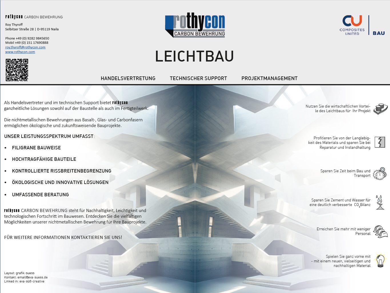 Bei rothycon CARBON BEWEHRUNG sind wir stolz darauf, eine Vorreiterrolle im Bereich des Leichtbaus einzunehmen. Unser Unternehmen arbeitet eng mit renommierten Produzenten von Glas-, Basalt-, Natur- und Carbonfaserbewehrungen zusammen, um maßgeschneiderte Lösungen für den Neubau sowie die Instandsetzung und Verstärkung anzubieten. Durch den Einsatz von Carbon und anderen leichten Materialien ermöglichen wir eine erhebliche Gewichtsreduktion bei Bauwerken, ohne dabei die Festigkeit zu beeinträchtigen. Unser Ziel ist es, Baukonstruktionen zu schaffen, die sowohl robust als auch effizient sind. Gemeinsam mit unseren Kunden, Architekten und Bauunternehmen arbeiten wir eng zusammen, um deren individuelle Anforderungen und Anwendungen zu erfüllen. Unsere Geschäftsführung spielt eine aktive Rolle als Netzwerk-Geschäftsführer des CU Bau im Composites United e. V., einem internationalen Netzwerk für den Leichtbau mit Hochleistungs-Faserverbundwerkstoffen. Zudem sind wir stolz darauf, im Unterausschuss nicht-metallische Bewehrungen beim Deutschen Ausschuss für Stahlbeton e. V. mitzuwirken.