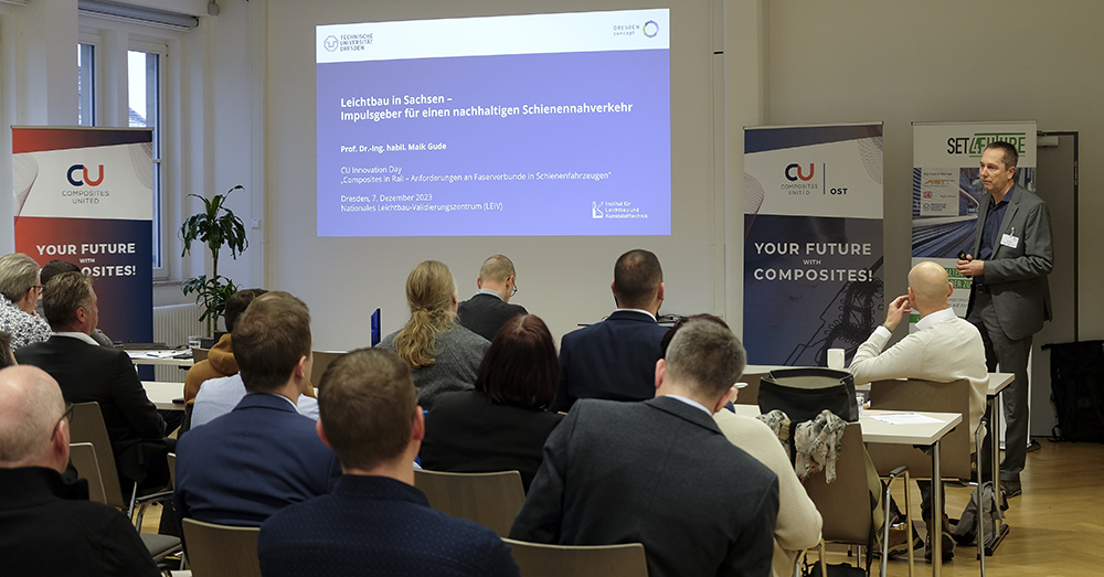 Gemeinsam mit dem Rail.S e. V. und der Leichtbau-Allianz Sachsen lud der Composites United e. V. (CU) am 07. Dezember 2023 zum CU Innovation Day „Composites in Rail“ nach Dresden ins Nationale Leichtbau-Validierungszentrum (LEIV) ein. Über 60 Interessierte folgten der Einladung und tauschten sich über Herausforderungen und Chancen von Composites in Schienenfahrzeugbau aus.