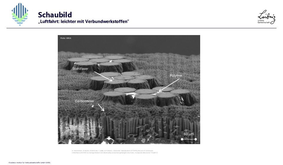 Das Leibniz-Institut für Verbundwerkstoffe forscht mit 120 Mitarbeitern entlang der gesamten Wertschöpfungskette von der Materialentwicklung über die Konstruktion bis hin zur Herstellung von Faserverbundwerkstoffen. Seit 10 Jahren forscht das IVW an metallfaserverstärkten CFK- (M-CFK)-Strukturen. Das multifunktionale Material mit bis zu 20 % Stahlfasern soll bessere Eigenschaften bei der Energieabsorption, der elektrischen Leitfähigkeit und dem Blitzschutz bieten. Produziert wird im Heißpress- oder Autoklav-Verfahren. In umfangreichen Tests konnte nachgewiesen werden, dass die Stahlfasern beim Nachversagen, also nach dem Bruch der Carbonfasern, die Strukturen stabilisieren und so für ein gutmütigeres Schadensverhalten sorgen. Die Dichte der resultierenden Verbunde liegt im Bereich von Aluminium, sodass es sich weiterhin um ein Leichtbaumaterial handelt. Das IVW sucht Partner für industrielle Anwendungen des neuen Materials.