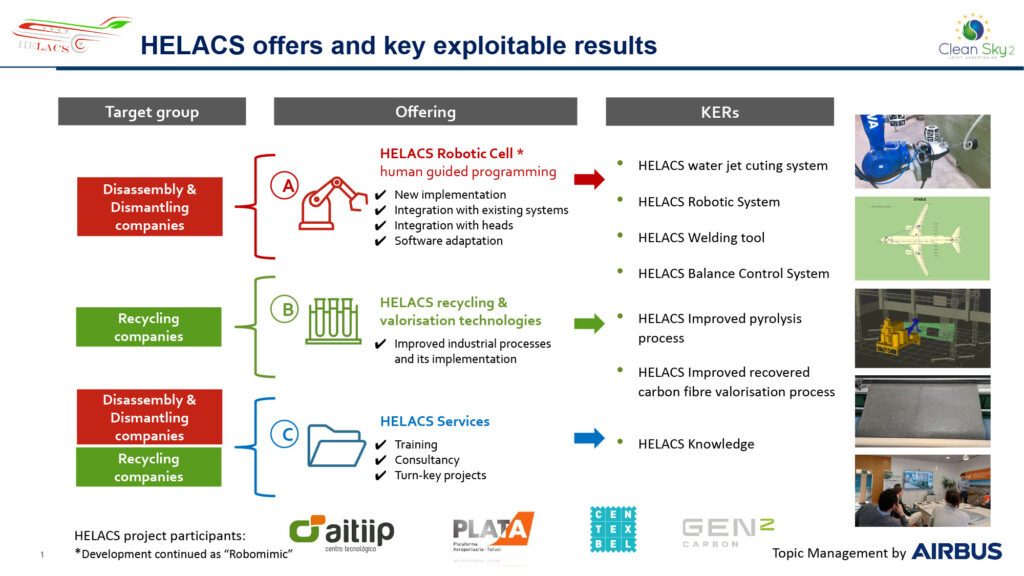 Das Konsortium im Projekt „Helacs“ entwickelt einen ganzheitlichen Beitrag zum Recycling von CFK-Strukturen. Kamerabasierte Roboter mit Digital-Twin-Unterstützung zerschneiden automatisiert Flugzeugstrukturen, um diese für das Recycling vorzubereiten. Der Pyrolyse-Prozess für CFK wird im Projekt weiter untersucht und für End-of-Life-Strukturen optimiert. Airbus kann sich die Beteiligung weiterer Partner zur Entwicklung einer kompletten Wertschöpfungskette vorstellen.