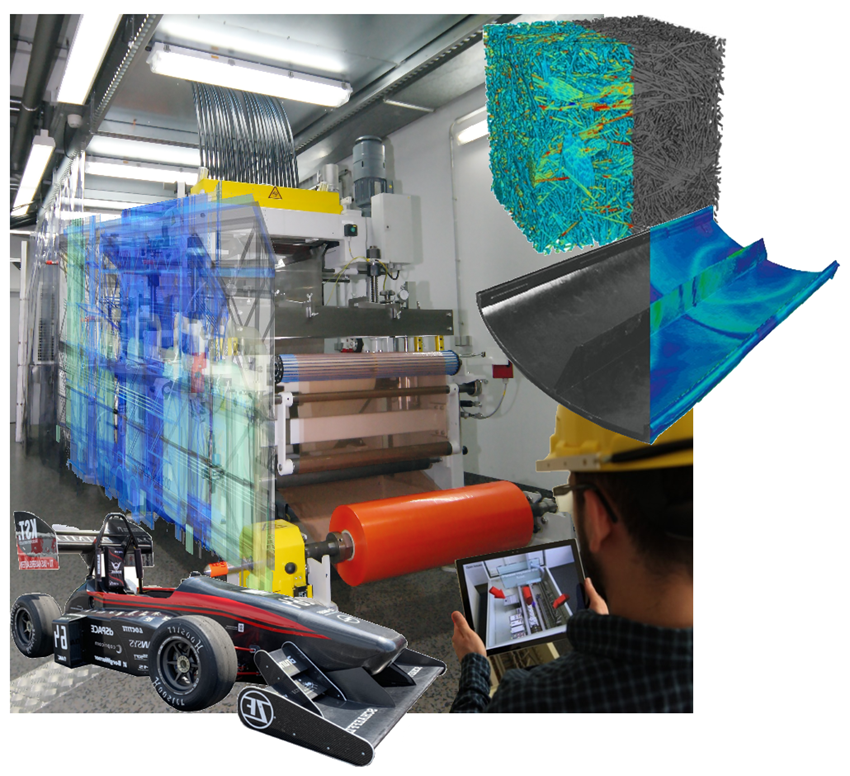 Gemeinschaftsprojekt vom Leibniz-Institut für Verbundwerkstoffe (IVW) soie denFraunhofer- Instituten ITWM, IESE und DFKI) in einem der drei Forschungs- und Entwicklungslabore „Digitale Zwillinge“ im Rahmen des von Fraunhofer geleiteten Projektes „High Performance Center Simulation and Software Based Innovation“. Das Bild zeigt eine SMC-Produktionslinie und verschiedene Aspekte einer möglichen Digitalisierung.