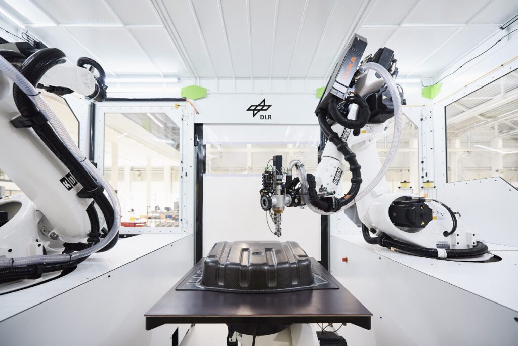 Das DLR-Institut für Fahrzeugkonzepte, in der Arena 2036 angesiedelt, forscht entlang der Prozesskette. Von einem Hersteller wurde das Projekt einer Laderaummulde für die Entwicklung einer umspritzten Struktur vorgegeben. Bei Bauraumänderungen sind neue Presswerkzeuge ein hoher Kostenfaktor, umspritze Strukturen können dieses Problem lösen. Deshalb sollte untersucht werden, wie die Rippenstrukturen am Bauteil mit thermoplastischem Material additiv aufgebracht werden können. Dazu wurde SEAM, eine hybride Fertigungsanlage eingesetzt. Das Entwicklungsprojekt wurde in den Schritten Materialqualifizierung, Verbindung und Anhaftung, Bahnenplanung, Simulation und Optimierung und schließlich Fertigung abgearbeitet. Das Institut bietet seine Unterstützung als Entwicklungspartner für Projekte von Übermorgen an.