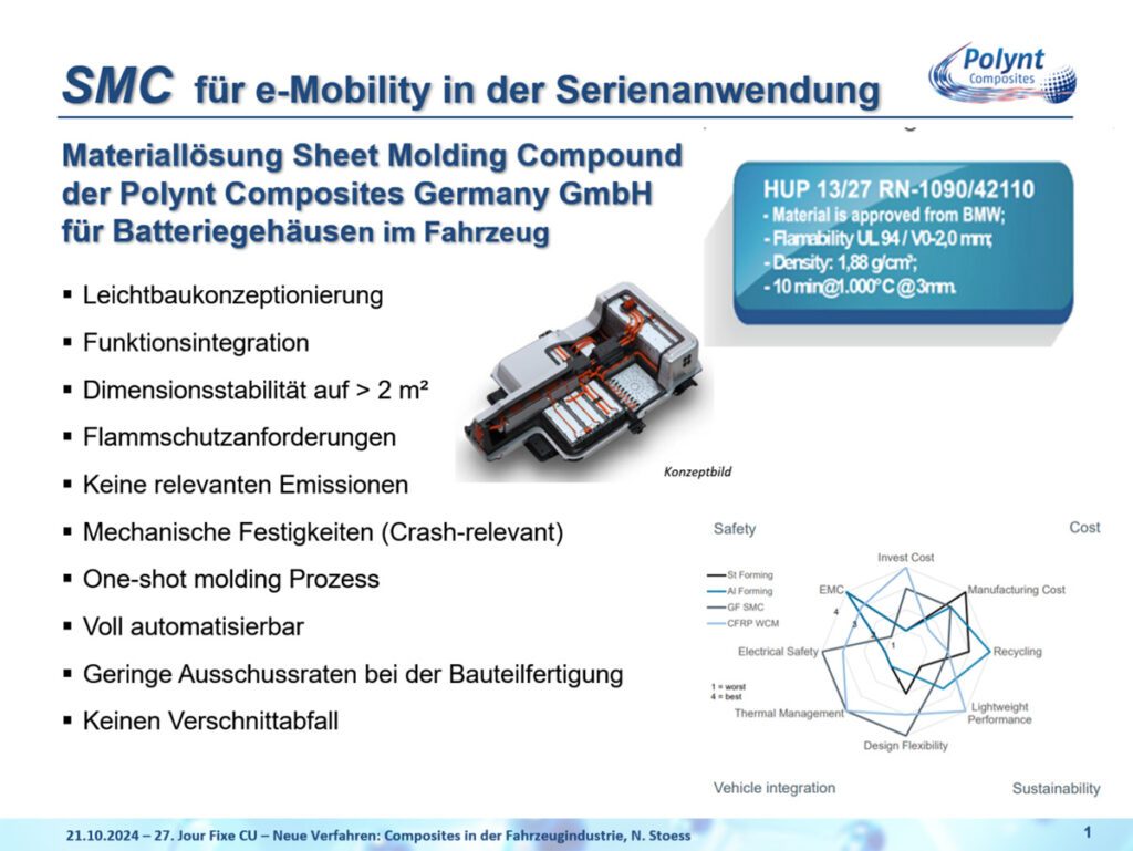 Polynt produziert mit 95 Mitarbeitern jährlich 25.000 t SMC, vor allem mit Glasfasern, aber auch mit Carbon- und biobasierten Fasern. Das Unternehmen konnte 2021 erste Erfahrungen mit einer Batterieabdeckung für VW-e-Up in der Serienfertigung sammeln. Als Lösung wurde eine vollflächige 2 qm mit Alu kaschierte Abdeckung entwickelt, welche auch die Elektronik zur Fahrgastzelle abschirmt. SMC bot mit einem ausgefeilten Zuschnitt einen geringen Ausschuss. Mit einer voll automatisierten Produktion wurde der Sprung in Serien für große Bauteile vollzogen. Es folgten weitere Batterieabdeckungen für VW und andere Hersteller. Heute stehen drei Materialfamilien zur Verfügung um, die unterschiedlichen Anforderungen der Hersteller an Brandschutz und die Dicke des Materials zu erfüllen. Konzepte für die sortenreine Rückgewinnung und Wiederverwertung sind aktuell noch nicht in Sicht. Das Unternehmen sucht weiterhin Partner für neue Rohstoffe und Materialien im Netzwerk von CU.