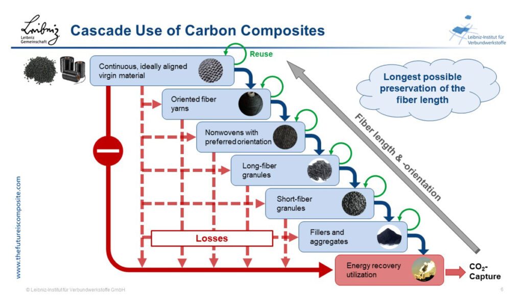 120.000 t jährlich produzierter Carbonfasern stehen 20.000 t an Waste gegenüber, davon 40 % Produktionsabfälle und 60 % End of Life-Abfälle. Die Abfallmenge gilt es in den Produktionsprozess zurückzuführen. Kohlenstofffasern sollten mehr als ein Leben haben und in Wiederverwertungskaskaden immer wieder einer hochwertigen Nutzung zugeführt werden. Die thermische Verwertung ist nur eine Option, wenn keine sinnvolle Verarbeitung mehr möglich ist. In einem DFG-Projekt am IVW werden Stapelfasern zu Garnen gewebt und zu Organoblechen verarbeitet. Das Material hat Vor- und Nachteile. Die Verarbeitung zu faltenfreien Radien ist einer der Vorteile.