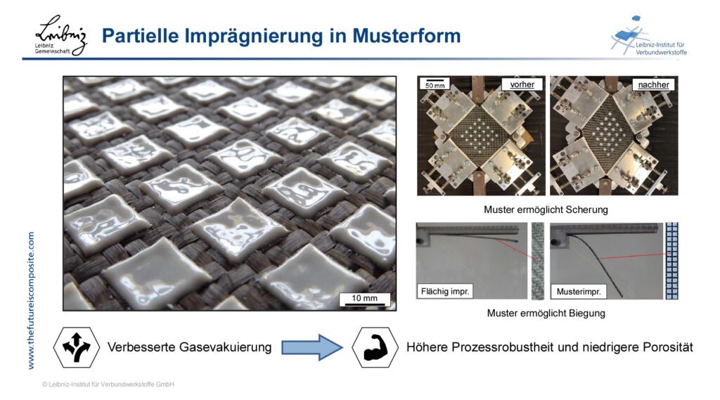 Als führende Forschungseinrichtung im Bereich der Verbundwerkstoffe forscht das Leibniz-Institut für Verbundwerkstoffe (IVW) entlang der gesamten Wertschöpfungskette, von der Materialentwicklung über die Konstruktion bis hin zu den industriellen Herstellungsprozessen von faserverstärkten Bauteilen und Komponenten. In allen Entwicklungsstufen ist das IVW als Dienstleister für die Industrie tätig. Jan Janzen stellte ein Entwicklungsprojekt für Feststoffharzprepregs für eine Out-of-Autoclave-Technologie vor. Das neue Material ist bei Raumtemperatur ohne Qualitätseinbußen lagerbar, ohne Aushärtung aufschmelzbar und durch eine niedrige Viskosität kurz vor der Aushärtung gekennzeichnet. Damit werden die Verarbeitungsvorteile von Thermo- und Duroplasten kombiniert. Eine partielle Imprägnierung in Musterform gewährleistet eine höhere Prozessrobustheit und niedrige Porosität. Gleichzeitig wird die Gasevakuierung verbessert. Die Musteraufbringung erfolgt aktuell mit einem umgerüsteten 3D-Drucker mit einer Extruderschnecke und Hotend. Künftig soll der Pulverauftrag mit dem Negativmuster im Siebdruck erfolgen. Das ermöglicht großflächige Bauteile. Das Verfahren verspricht hohe Prozessrobustheit und gute Möglichkeiten für die Herstellung dreidimensionaler Teile. Herr Janzen steht als Gesprächspartner für das Entwicklungsprojekte auf diesem Gebiet zur Verfügung.