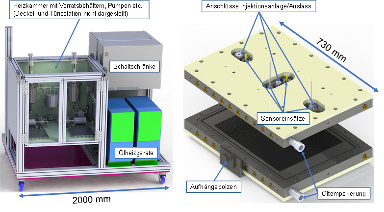Am Leibniz-Institut für Verbundwerkstoffe im Aufbau befindliche Entwicklungsumgebung (Injektionsanlage und Technologieträgerwerkzeug) für Flüssigimprägnierverfahren mit in situ polymerisierenden Thermoplaste (z. B. ε-Caprolactam zu Polyamid 6)